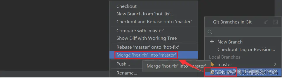 点击hot-fix,选中Merge把hot-fix合并到master!