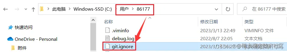 (3)在.gitconfig 文件中引用忽略配置文件(此文件在 Windows 的家目录中)