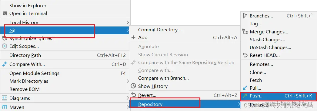 右键点击项目,可以将当前分支的内容 push 到 GitHub 的远程仓库中。
