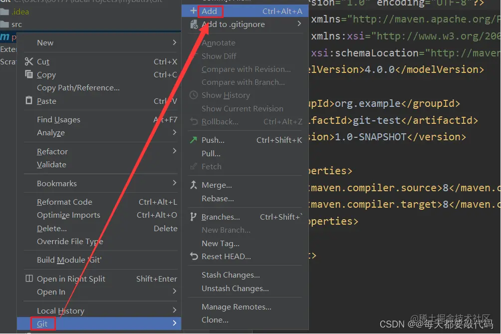 右键点击项目选择 Git -> Add 将项目添加到暂存区!