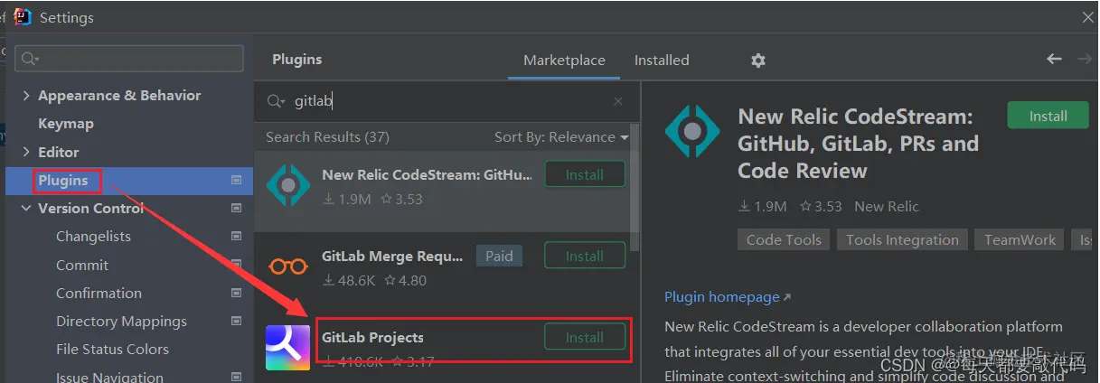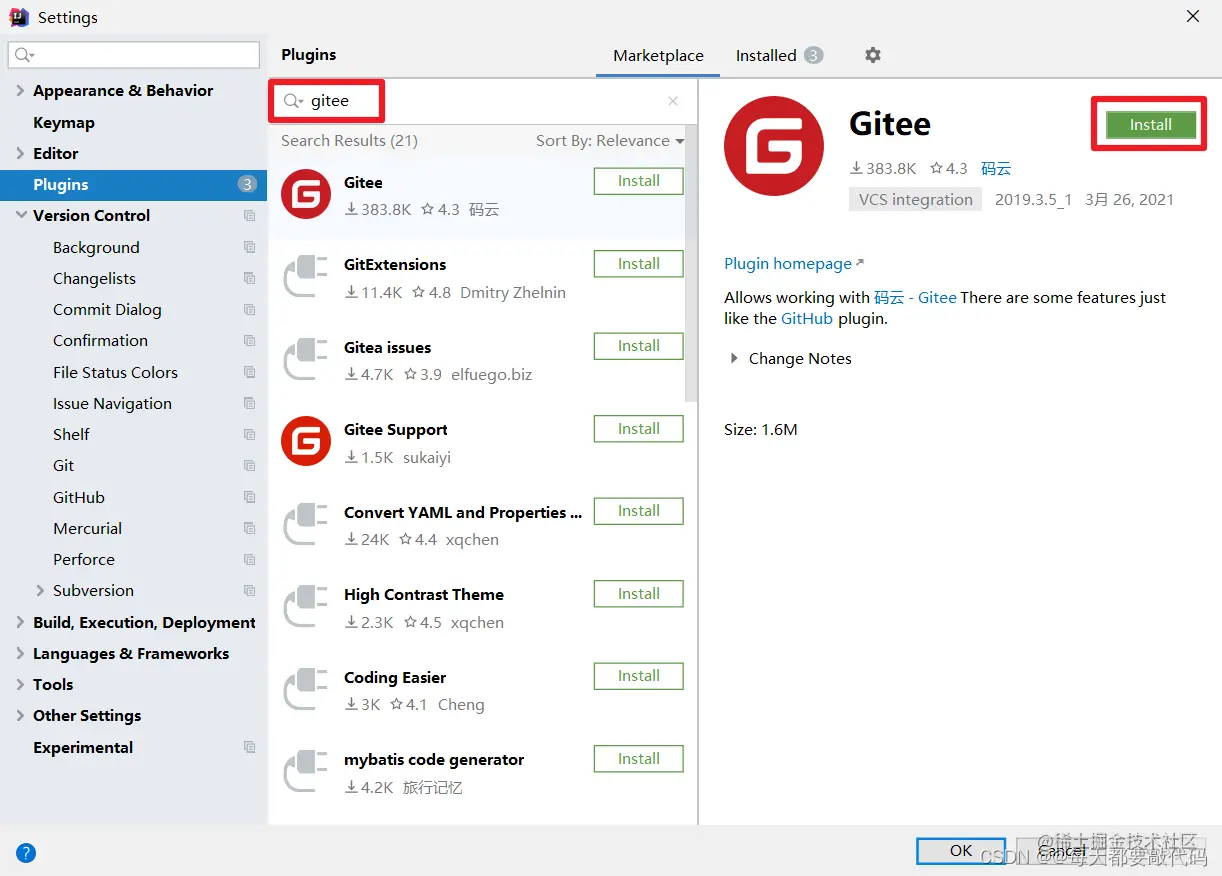 Idea 默认不带码云插件,我们第一步要安装 Gitee 插件。如图所示,在 Idea 插件商店搜索 Gitee,然后点击右侧的 Install 按钮!