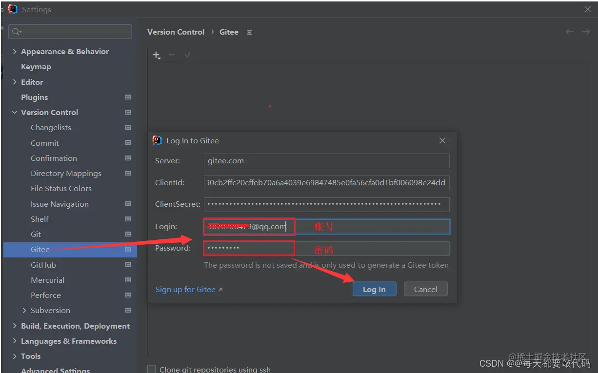 然后在码云插件里面添加码云帐号,我们就可以用 Idea 连接码云了。