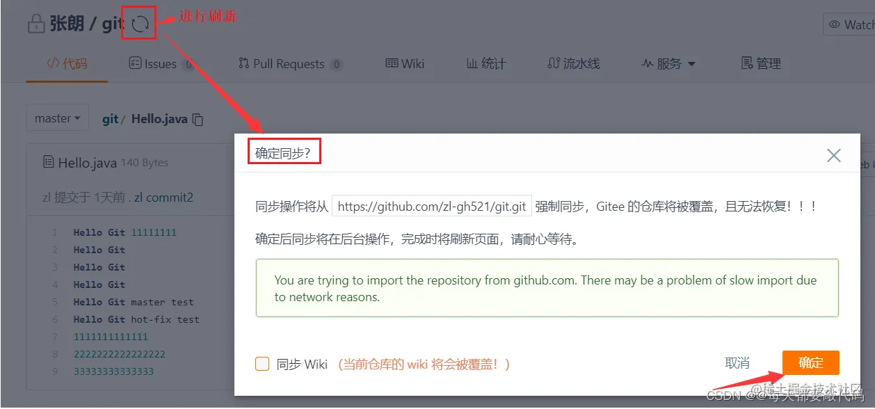 如果此时GitHub上这个项目的代码改变了,在码云项目端可以手动重新同步,进行更新!