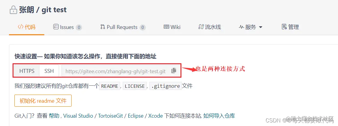 远程库创建好以后,就可以看到 HTTPS 和 SSH 的链接