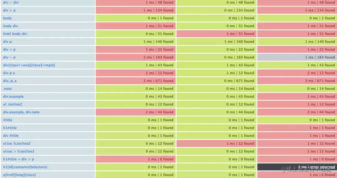 如上图,可以看到不同的 CSS 选择器的组合,解析速度也会受到不同的影响。