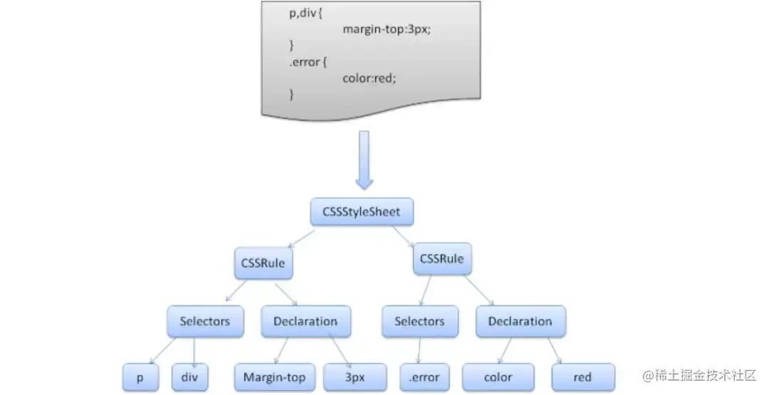 2、由于目前规则依然是不易于处理的,还需要将之转换成 CSSRuleSet。也就是将所有的纯样式规则存储在对应的集合当中,这种集合的抽象就是 CSSRuleSet;