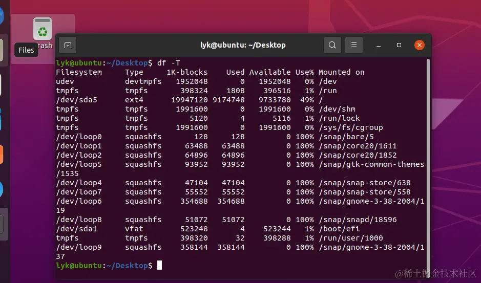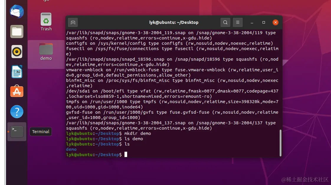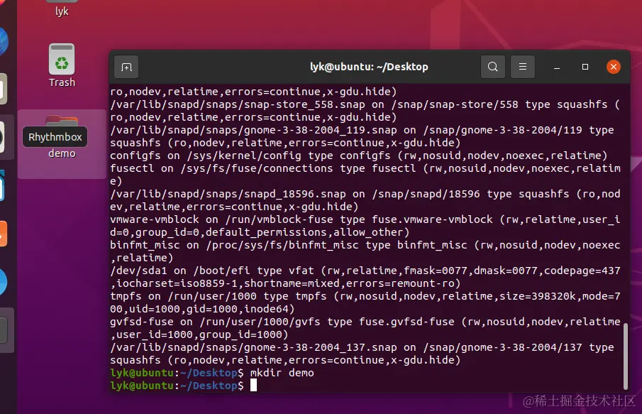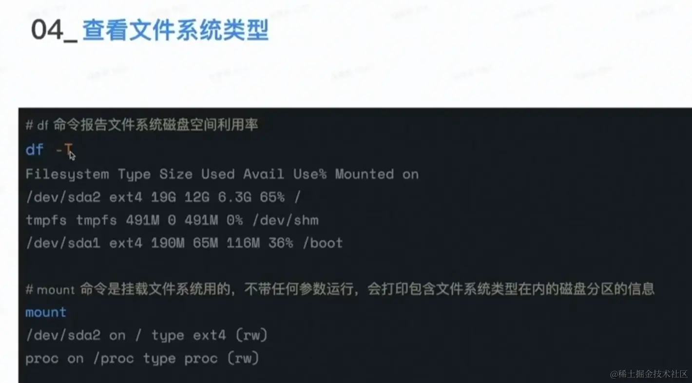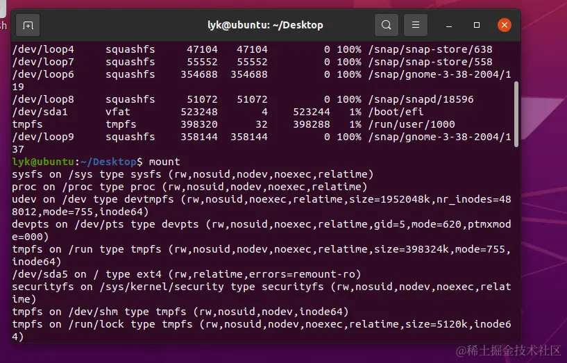 mount 命令是挂载文件系统用的,不带任何参数运行,会打印包含文件系统类型在内的磁盘分区的信息: