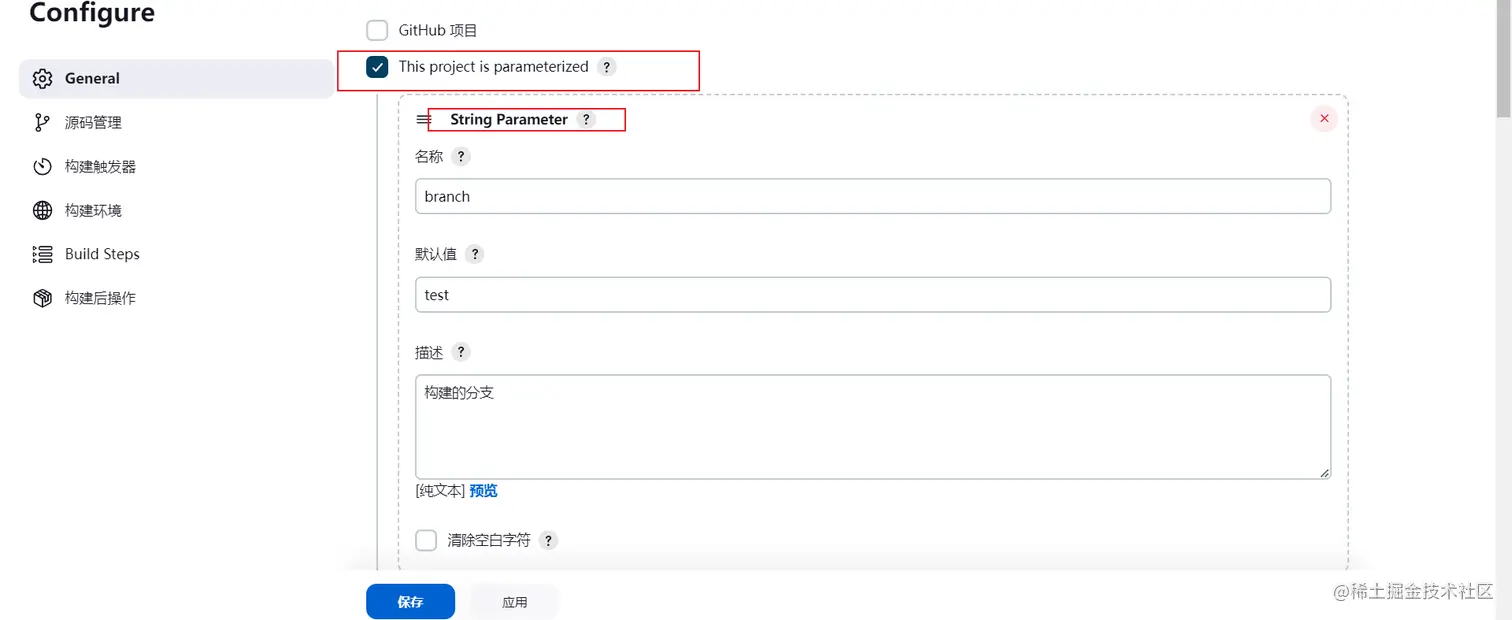 一个String参数,参数名为branch,默认值为test,描述为构建的分支。