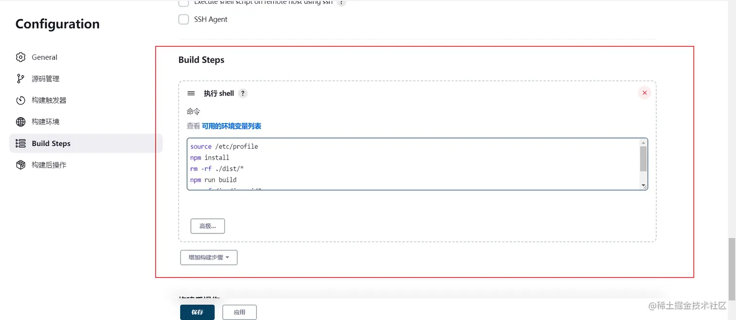 source /etc/profile : 加载环境变量。让jenkins可以执行对应的npm命令。