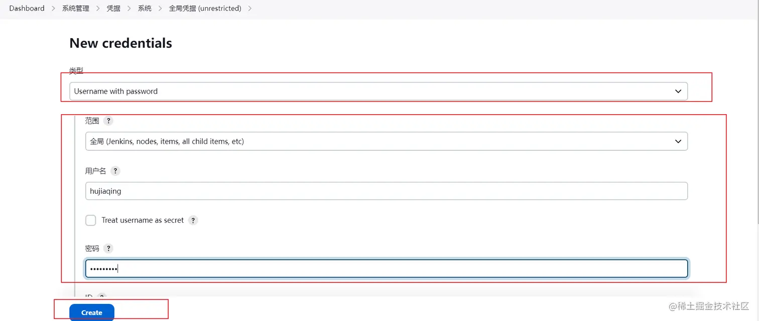 填写用户名,密码。点击创建。 也可以选择ssh类型,你需要配置相关的ssh凭证,我这里直接用的用户名密码来做的。