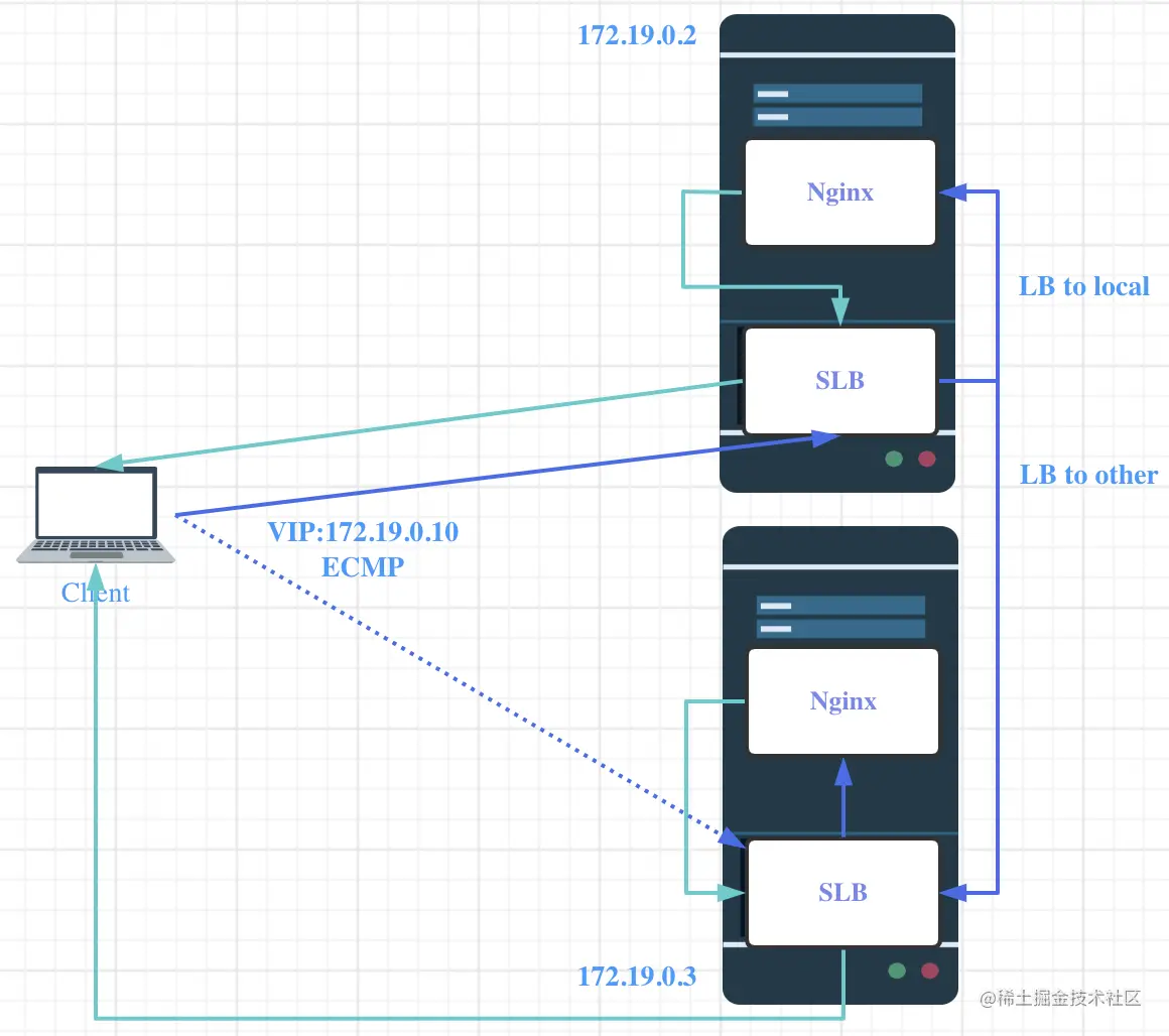 vip 采用了 ecmp,一次请求只会路由到一个 mix 上,mis 上的 slb 可能会把这个转发到本地 app(本文以 Nginx 为例) 或其它 mix,但是响应一定是从 mix 直接回去的,而不会再次经过其它 mix。