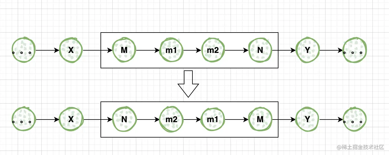 先看下两组之间的连接,假设现在要操作的这组数为[M,N],上一组的结尾为X,下一组的开头为Y,那要怎么操作呢?