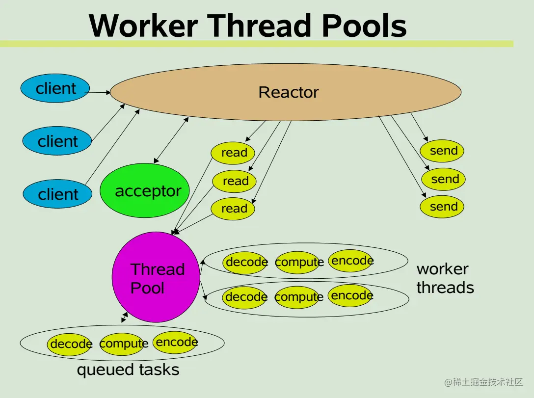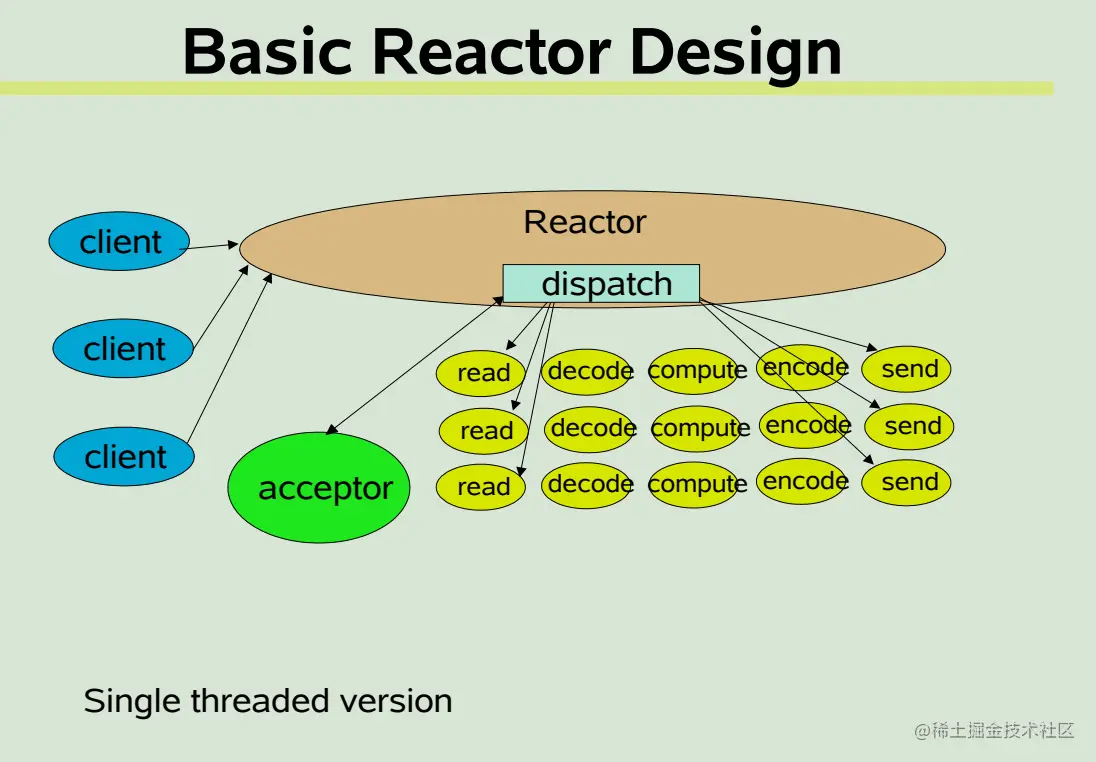 可以看到,Reactor模式的思想很简单:事件驱动。