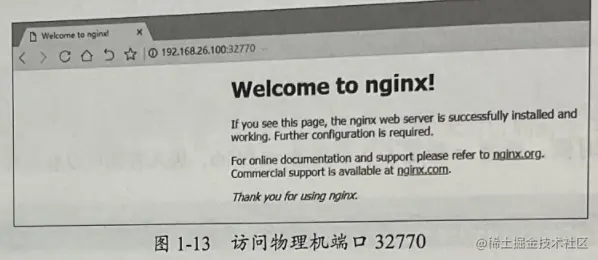 可以看到映射到物理机的端口32770上了,访问物理机的端口32770,即可访问到web容器,如图1-13所示。