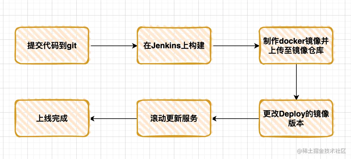 过了几天,又有一次迭代上线,因为是迁移到了k8s上,Jenkins的构建步骤也发生了写变化,部署流程如下: