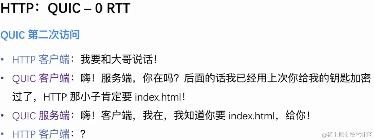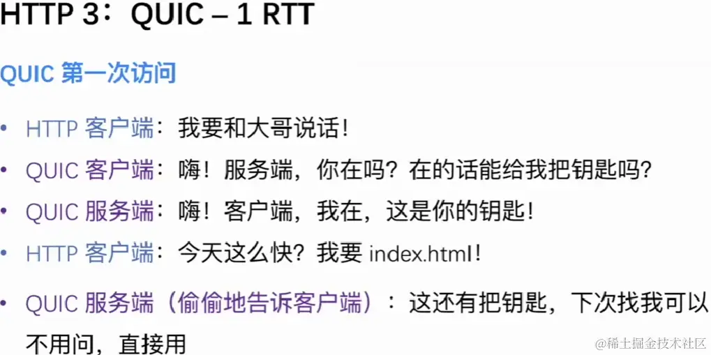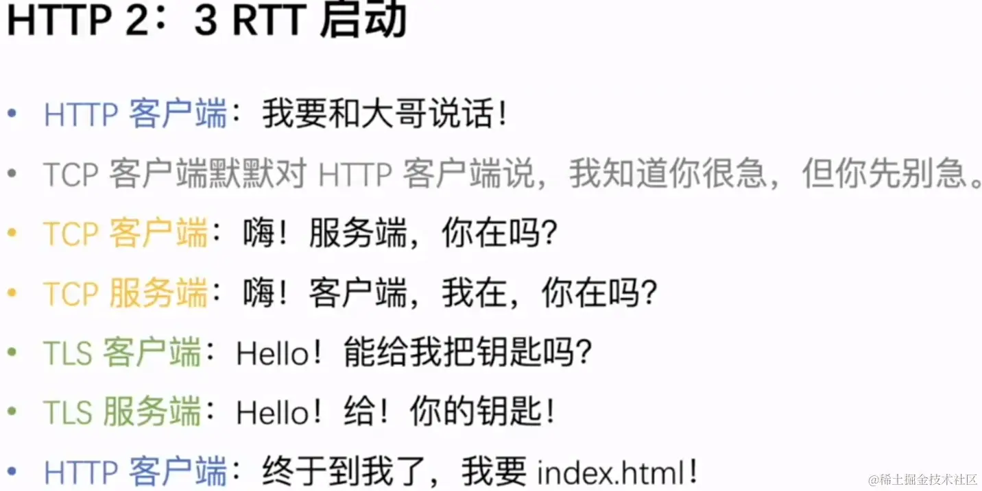 - 这三个RTT包括TCP建立连接需要一个RTT,TLS建立连接需要两个RTT,TLS1.2及以下需要两个