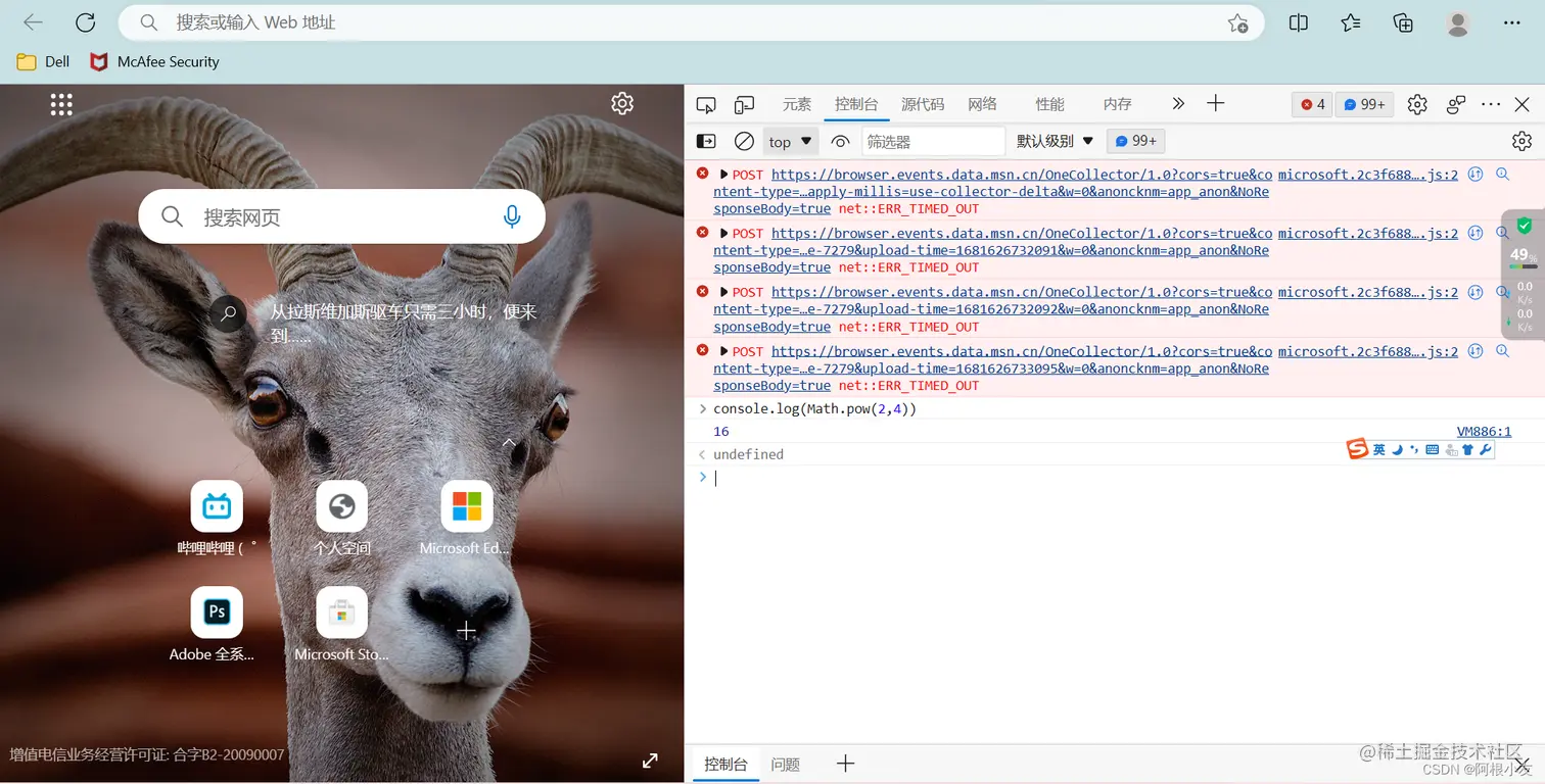 (这里我的目标是获取2的4次幂的结果)由上表可知pow的意思就是获取基数次幂,(看图)我这里console.log()是输出的意思,然后我输出了Math对象的方法pow进行运算。用(对象.方法)的格式进行访问。写下console.log