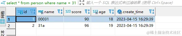 INSERT INTO test.person (id, name, score, age, create_time) VALUES(1, '00031', 90, 18, '2023-04-15 16:29:39');