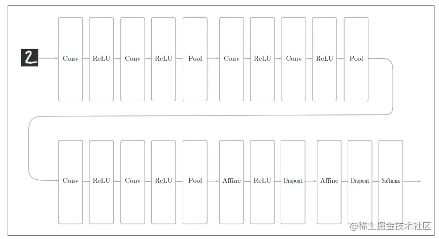 书中的模型是参考VGG模型进行了改造,最终准确率达到99.35%,这里使用的卷积层全都是 3 × 3 的小型滤波器,特点是随着层的加深,通道数变大,并且后面的全连接层中使用了 Dropout 层,这个网络使用 He 初始值作为权重的初始值,基于 Adam 的最优化,激活函数使用ReLU。如下图