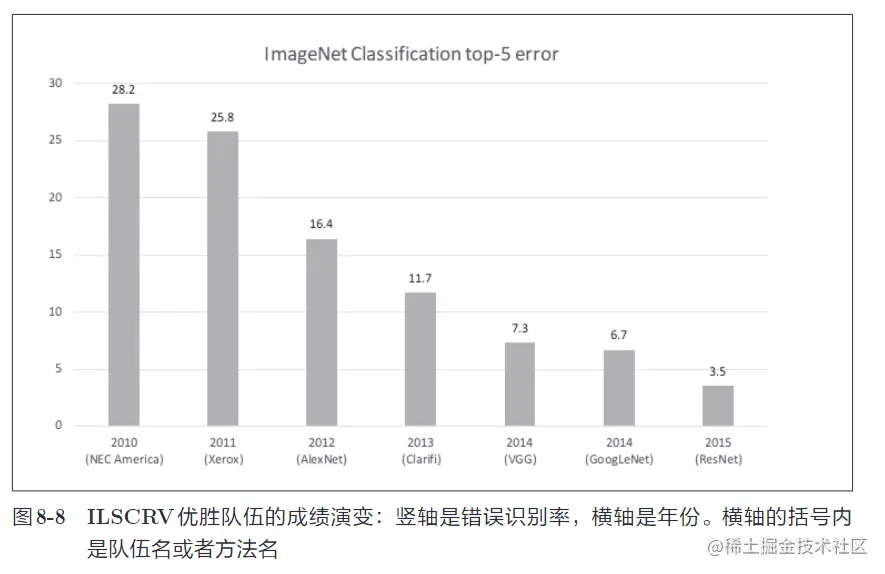 需要注意的是,以 2012 年为界,之后基于深度学习的方法一直居于首位。实际上,我们发现 2012 年的 AlexNet 大幅降低了错误识别率。并且,此后基于深度学习的方法不断在提升识别精度。