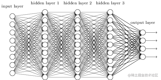 说到神经网络大家可能会浮现类似这种图,我第一次也是被这种图吓到的。如果把每条线当作电线,整个图看作一个电网可能会容易理解点,比如现在有这样的问题,我输入随机的电流经过复杂的电网,因为每一条电线的电阻不一样,输出的电压就不一样了,根据以前的经验我知道一些输入电流和对应的输出电压,现在想知道输入全新电流的输出电压值 。
