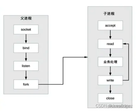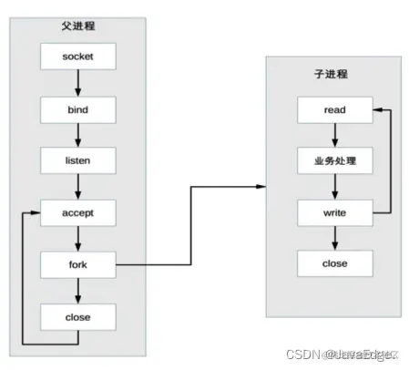一种常见的多进程并发服务器架构。在该架构中,对每个客户端连接请求创建一个新子进程,来处理该客户端的请求和响应。即当有多个客户端连接时,服务端就会启动多个子进程进行并发处理,从而提高服务器的并发性和处理性能。