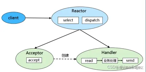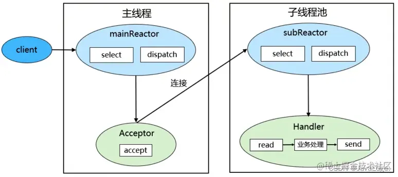 - 主线程中,Reactor 对象通过 select 监控连接事件,收到事件后通过 dispatch 进行分发