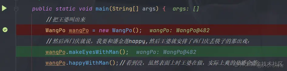 wangPo.happyWithMan();//看到没,虽然表面上时王婆在做,实际上爽的是潘金莲