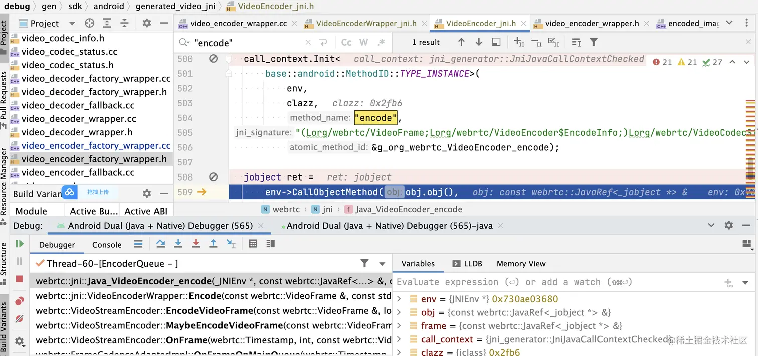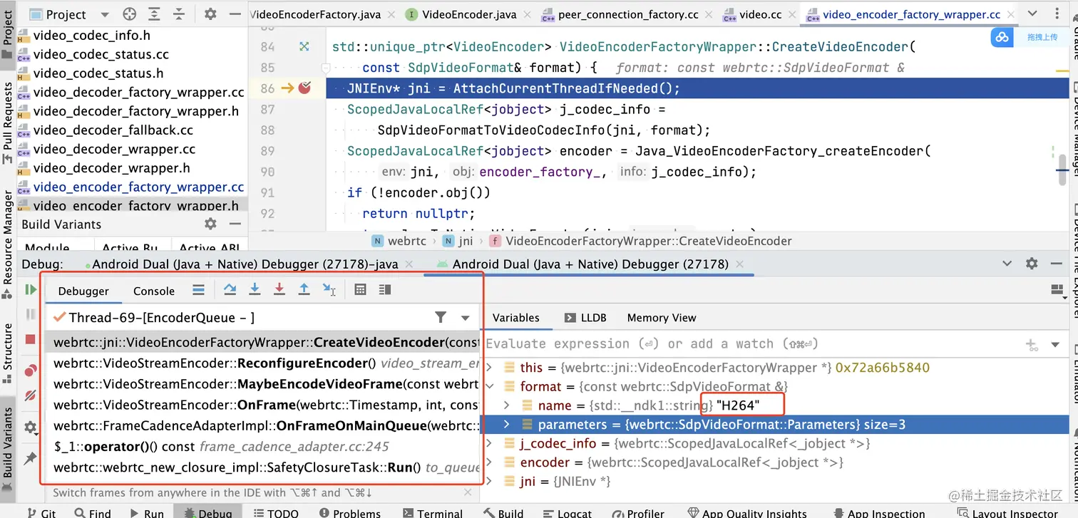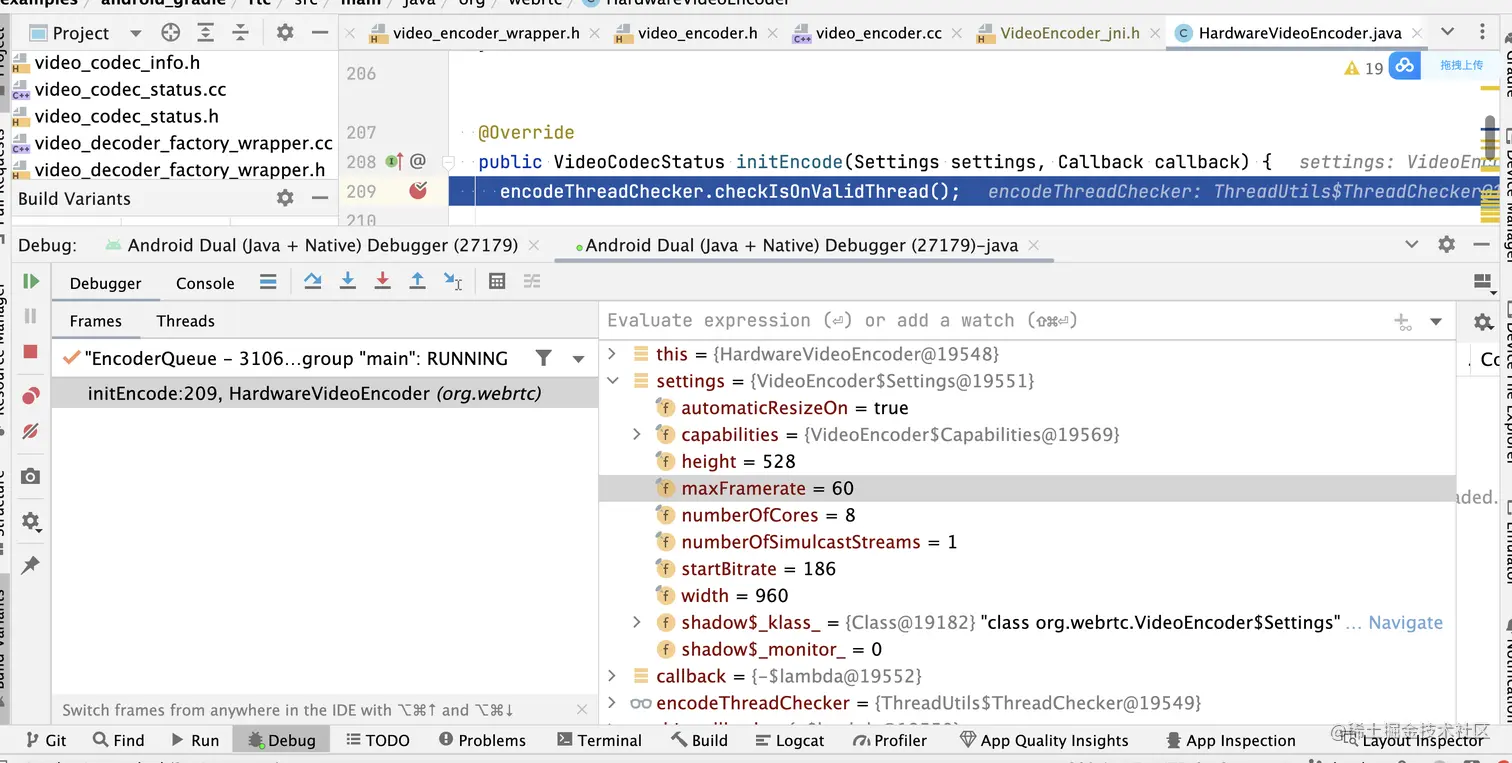 这不就是我们找到了 createEncoder jni 调用的入口吗?那么是什么时候调用的呢?我们进行 debug 一下