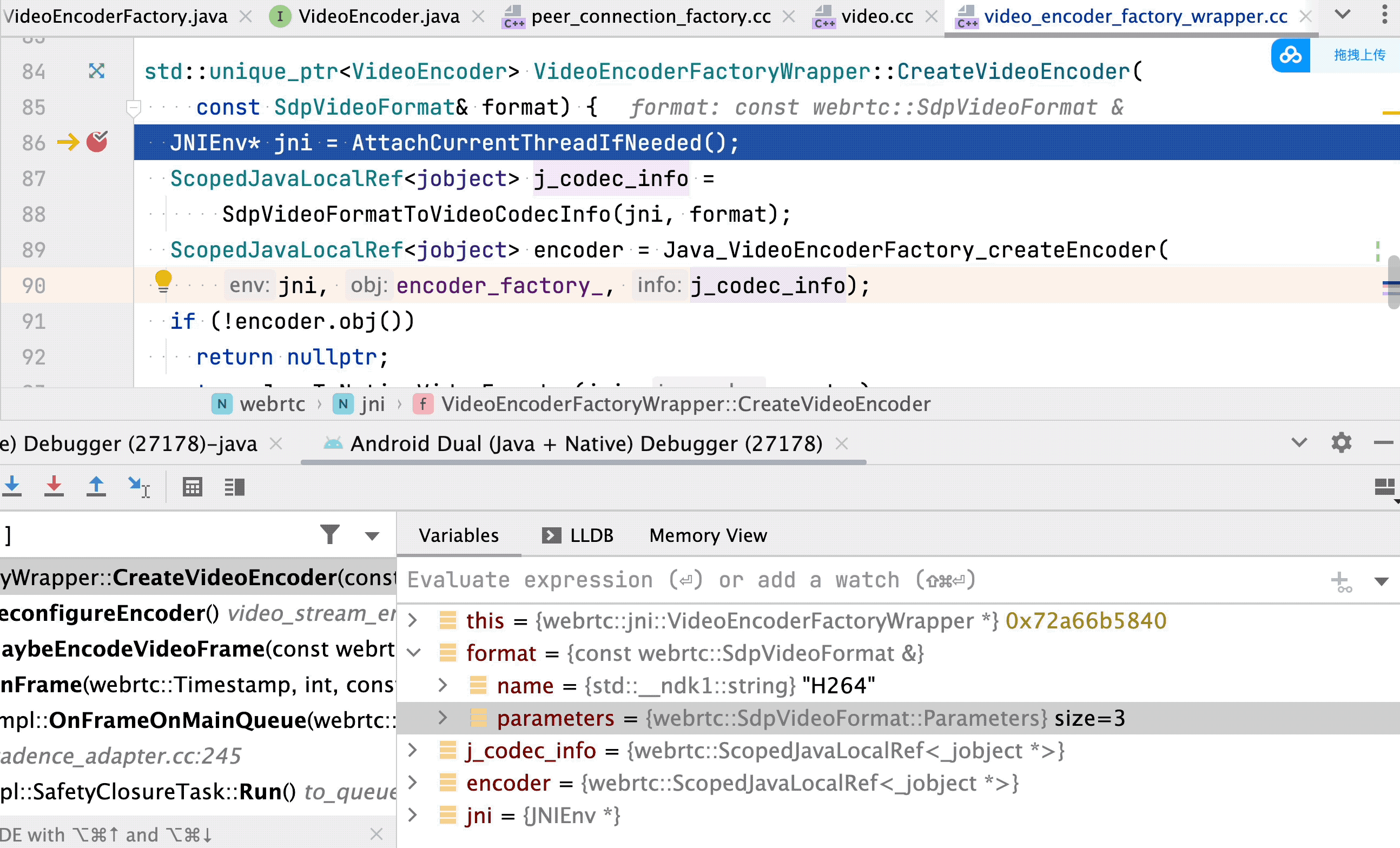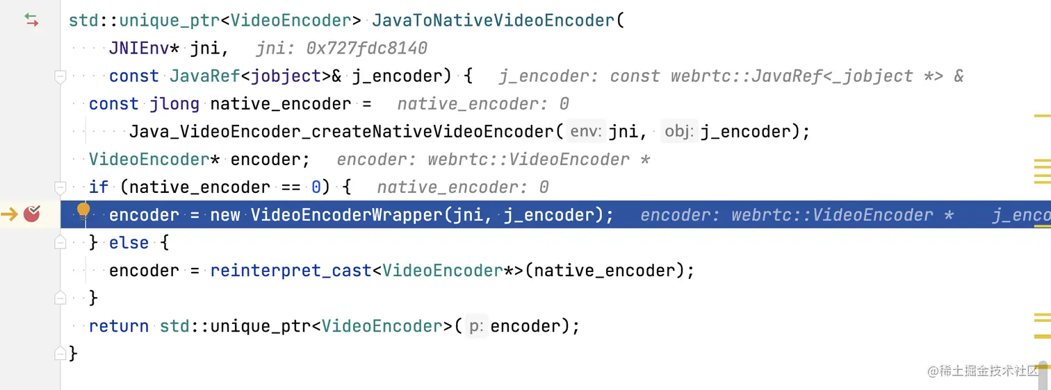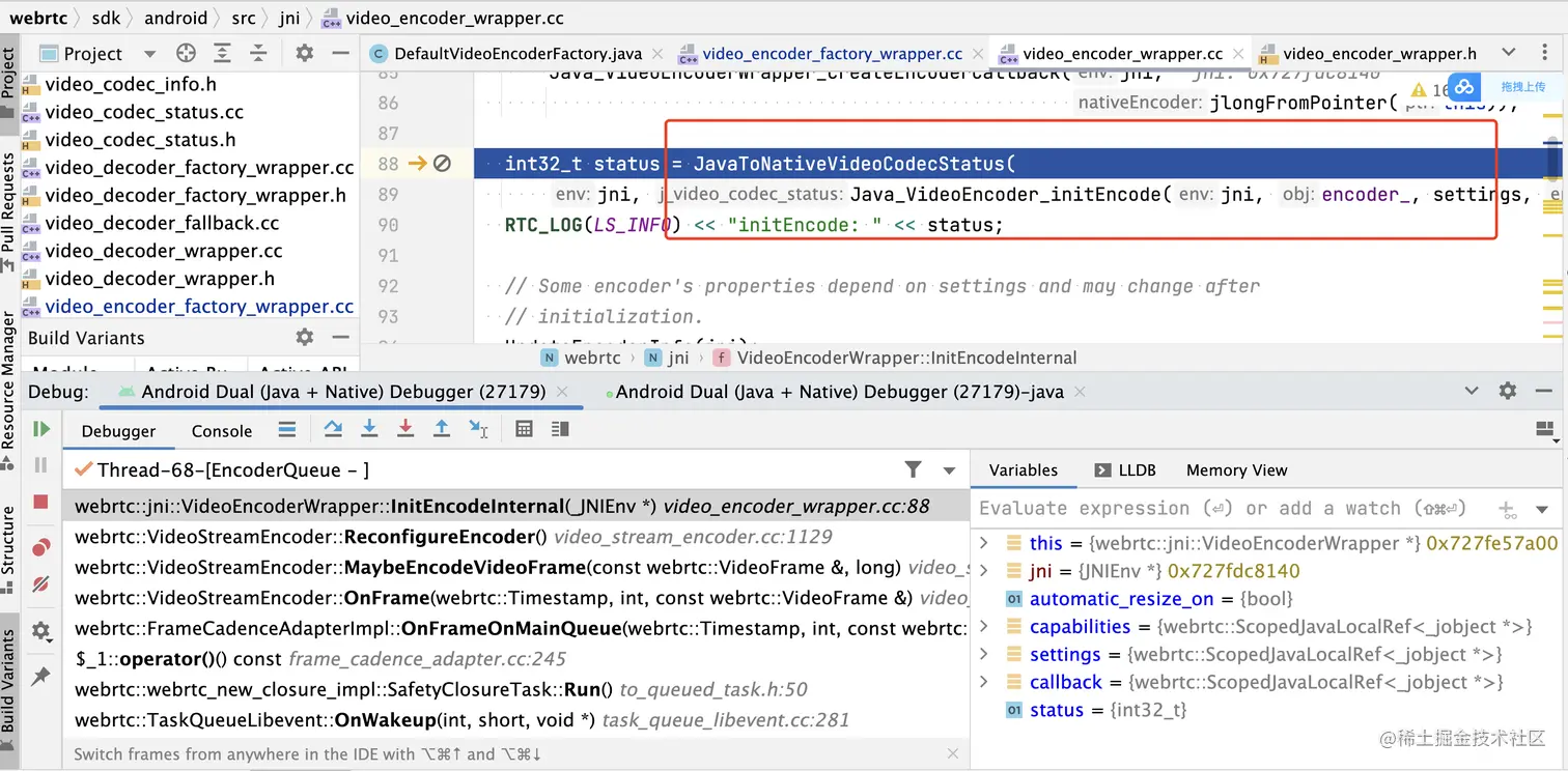 这不就是我们找到了 createEncoder jni 调用的入口吗?那么是什么时候调用的呢?我们进行 debug 一下