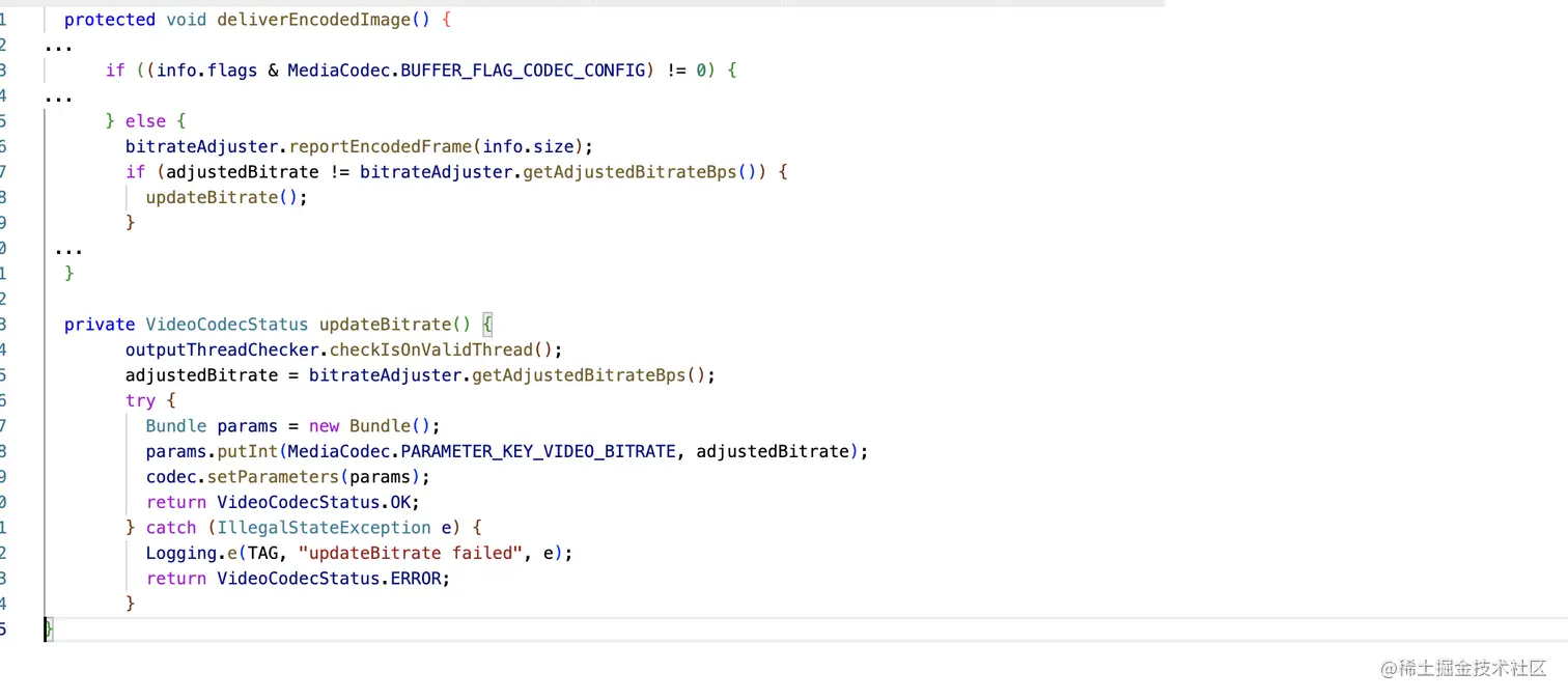 当比特率发生变化时,WebRTC 会调用 VideoEncoder.setRateAllocation() 方法来通知更新比特率。