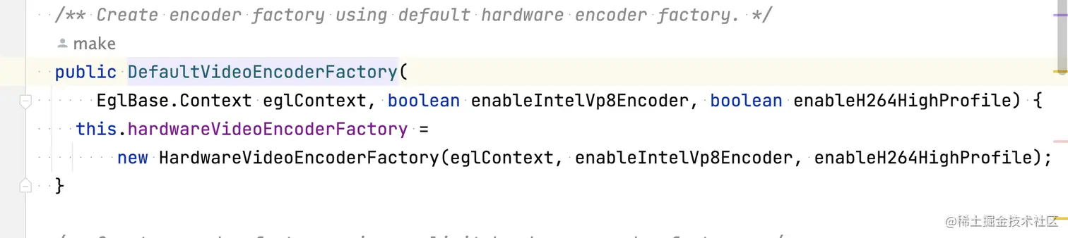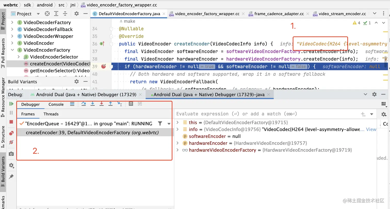 内部实例化了一个 HardwareVideoEncoderFactory ,我们在 DefaultVideoEncoderFactory 中看到了 createEncoder 函数,这里的内部就是实例化 HardwareVideoEncoder 的地方,我们先 debug 看下是哪里调用的,如下图所示,