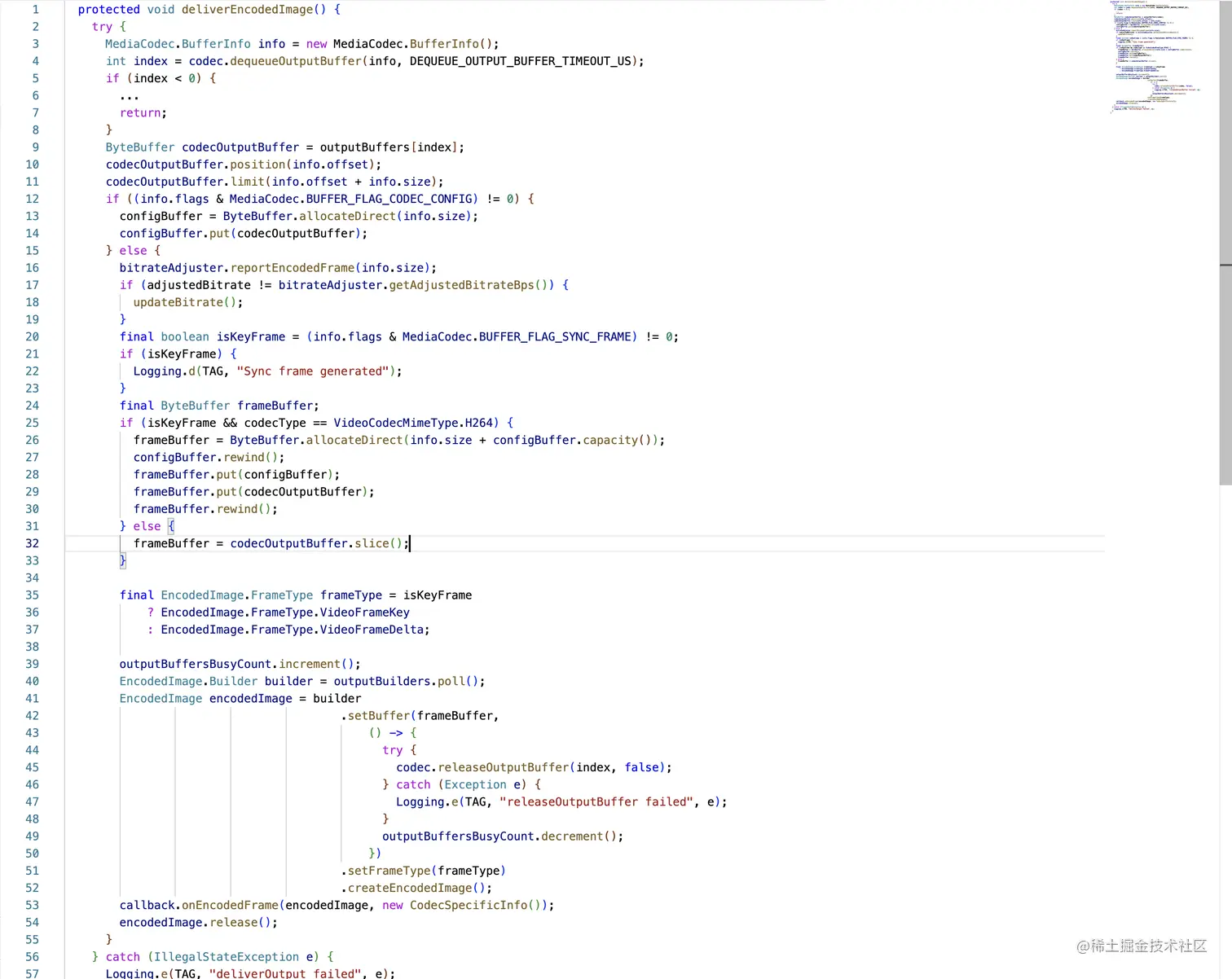 总之,这段代码的目标是从 MediaCodec 中获取编码后的视频帧,对关键帧进行处理,并将结果传递给回调函数。