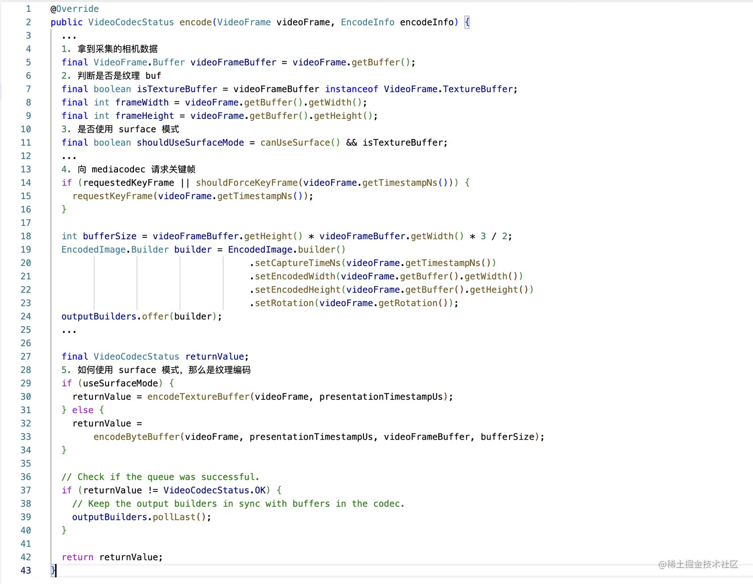 本文将重点介绍在 Android 平台上,WebRTC 是如何使用 MediaCodec 对视频数据进行编码,以及在整个编码过程中 webrtc native 与 java 的流程交互。