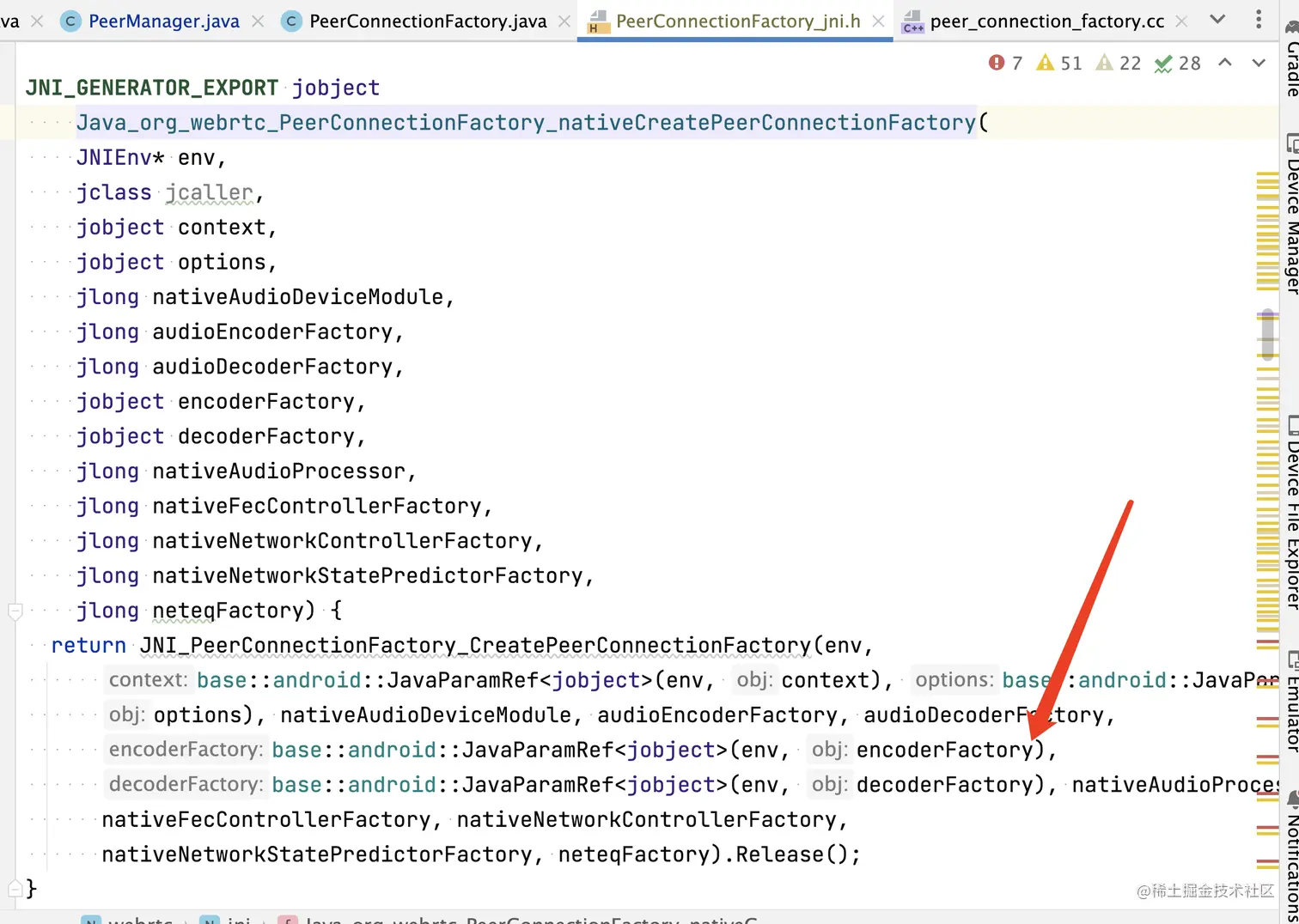 发现调用栈并没有在 java 端,那肯定在 native 端了,我们可以通过 createPeerConnectionFactory 查看下调用