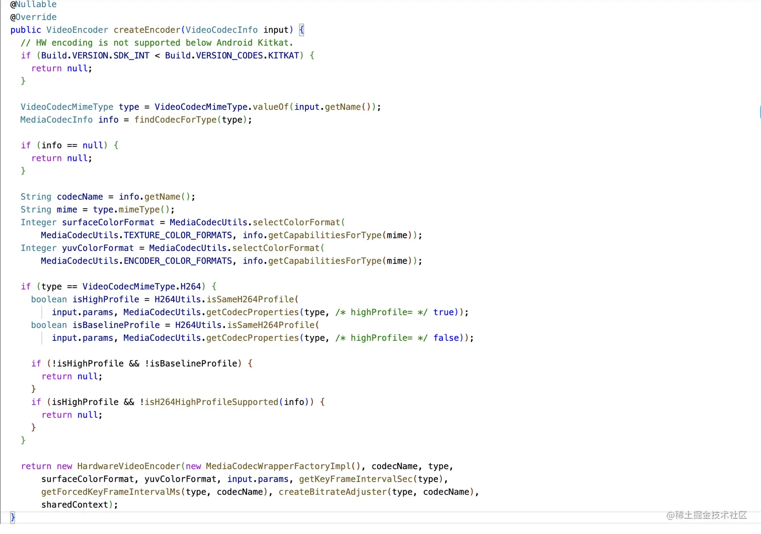 这里就是我们所熟悉的 MediaCodec 编码配置了,根据上面的序号我们知道,先根据媒体协商后的编码器名称来创建一个 MediaCodec 对象,然后配置一些必要的参数,最后启动编码器.