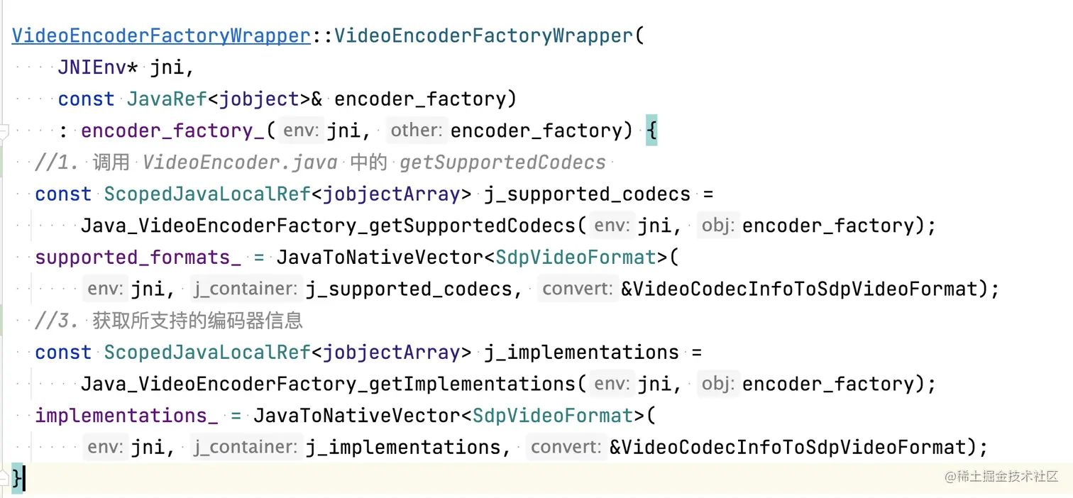 通过一系列的调用,我们发现java 端的引用,被封装成了 c++ 端的 VideoEncoderFactoryWrapper ,我们看一下它的构造函数