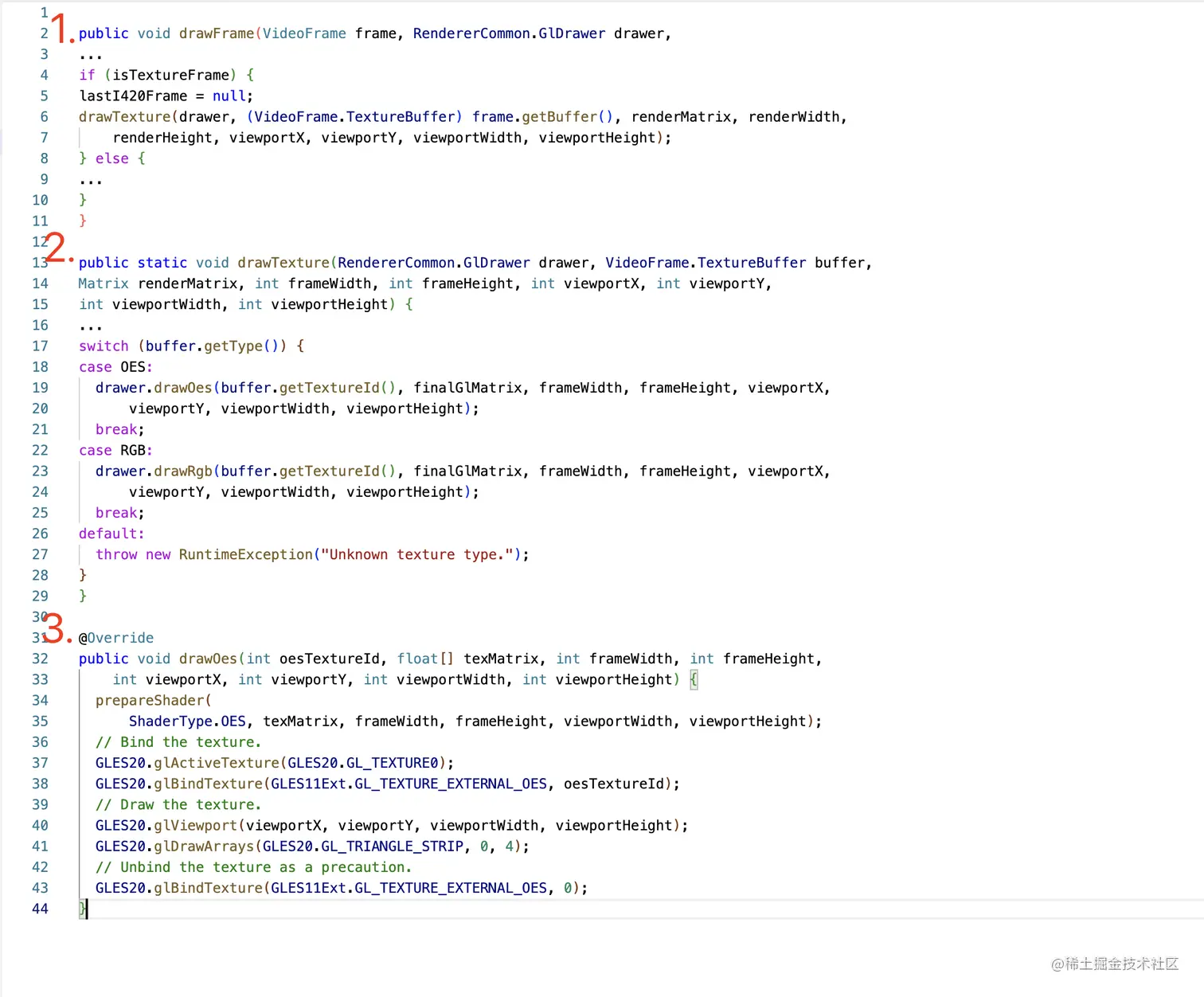 第一步的 1-3 小点主要是通过 OpenGL ES 将 OES 纹理数据绘制出来,然后第二大步的 textureEglBase.swapBuffers(...) 主要是将 OpenGL ES 处理后的图像数据提交给 EGLSurface 。经过这些操作后纹理数据就提交给 MediaCodec 的 inputsurface 了。