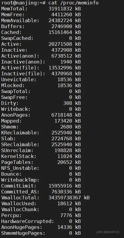 Linux 内核将系统的内存信息保存在 /proc/meminfo 文件中,可以通过读取该文件来获取系统的内存使用情况。可以使用以下命令查看 /proc/meminfo 文件的内容: