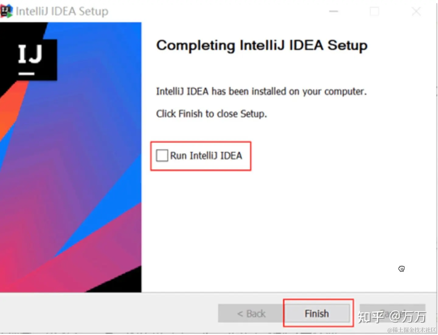 等待安装进度条达到 100% 后,点击 Finish,IntelliJ IDEA 就安装完成了。可以勾选 Run IntelliJ IDEA 选项,表示关闭此窗口后运行 IDEA。