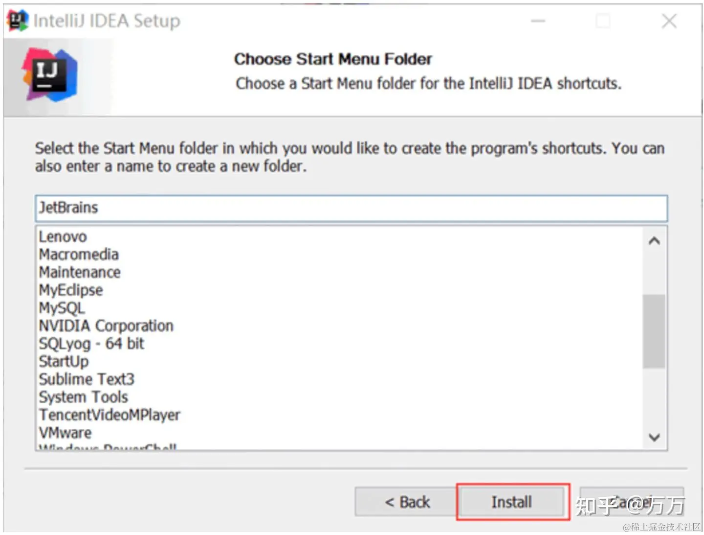 选择开始菜单文件夹后,点击 Install 等待安装。如图