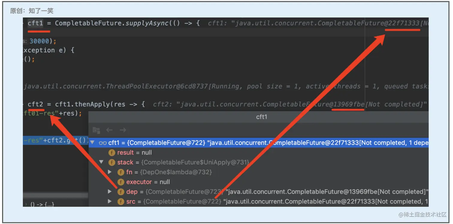 即CF之间的单个依赖关系;这里使用「thenApply」方法演示,为了看到效果,使「cft1」长时间休眠,断点查看「stack」结构;