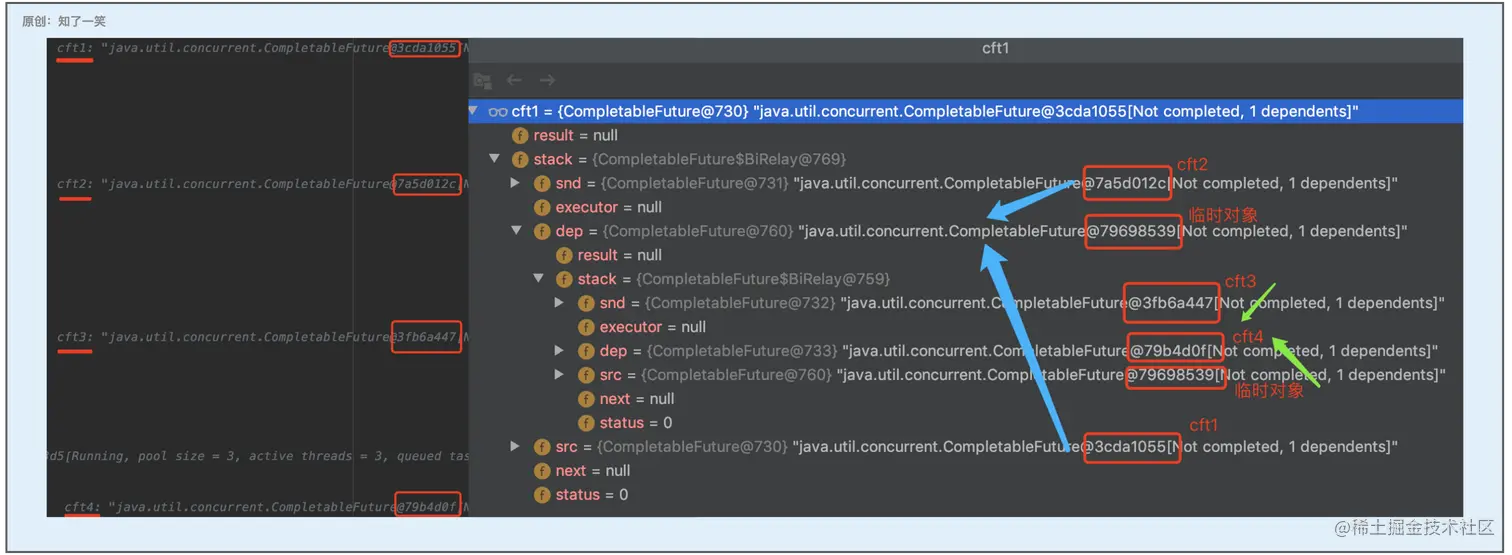 可以调整断点代码,让「cft1」先处于完成状态,再查看其运行时结构,从而分析完整的逻辑;