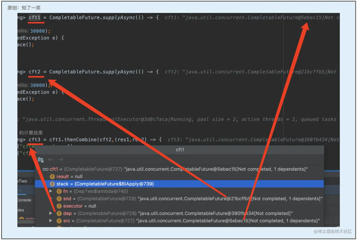 即一个CF同时依赖两个CF;这里使用「thenCombine」方法演示;为了看到效果,使「cft1、cft2」长时间休眠,断点查看「stack」结构;