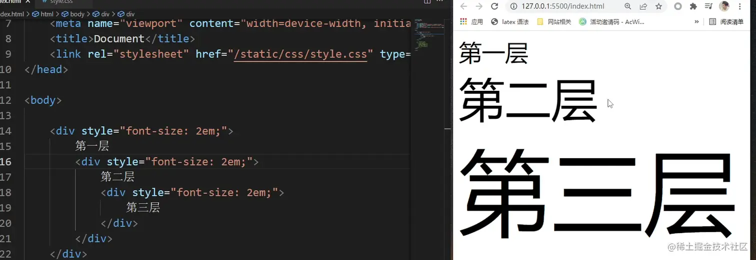 同样的,第三层会继承第二层的64px字体大小,因此第三层默认字体大小是64px,两倍之后就变成了128px。所以呈现出来了字号一层比一层大的样式。