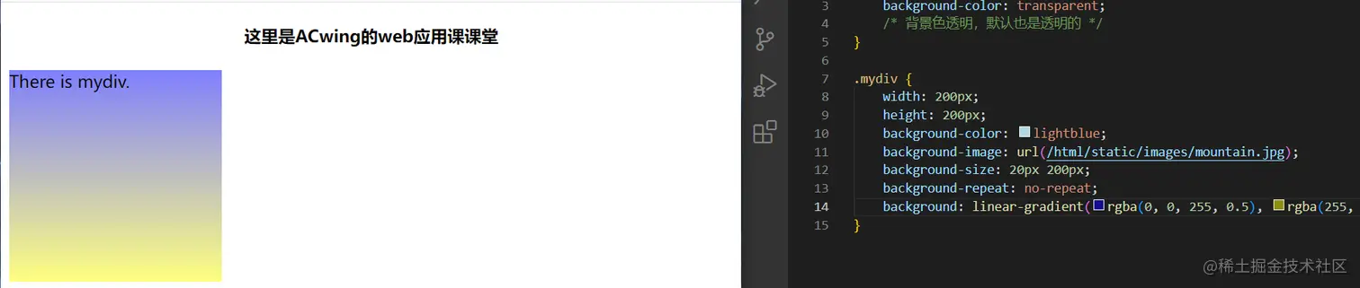 渐变色:linear-gradient(rgba(0, 0, 255, 0.5), rgba(255, 255, 0, 0.5))