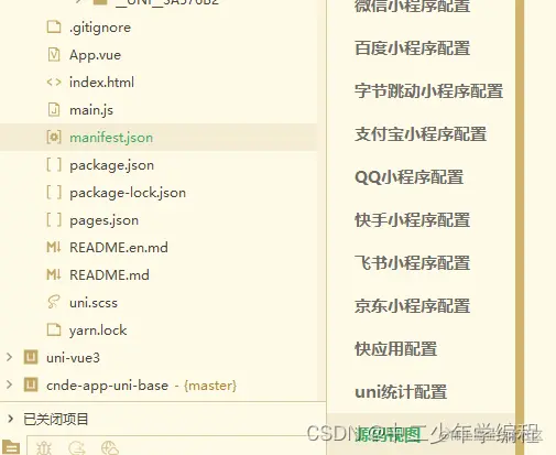 问题解决: 1. 微信小程序项目:可直接在project.config.json中定义miniprogramRoot属性,这是在定义项目根目录,大白话就是项目的一些路径属性配置在了project.config.json,项目通过这个配置找app.json(或者sitemap.json)的时候,发现路径不对,找不到了,所以要在project.config.json中配置我们个性化的文件目录。这里建议把project.config.json、app.json、sitemap.json等配置都放在项目根目录,然后配置“miniprogramRoot:‘./’” 2. uniapp项目:原理和上面一致。配置manifest.json,打开源码视图,如图: