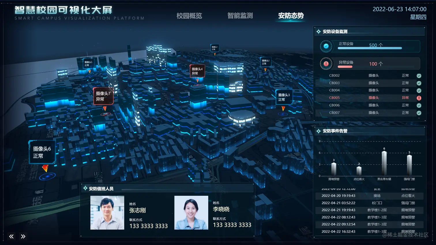 智慧校园集成视频监控、人脸识别、安防人员信息、安防事件管理等监控,通过统一平台对数据进行综合处理,基于校园三维场景对各类设备的监控和运维管理,实现场景联动和统一展示管理,增强保障校园安全防范管理,提供一个平安、舒适的学习环境。