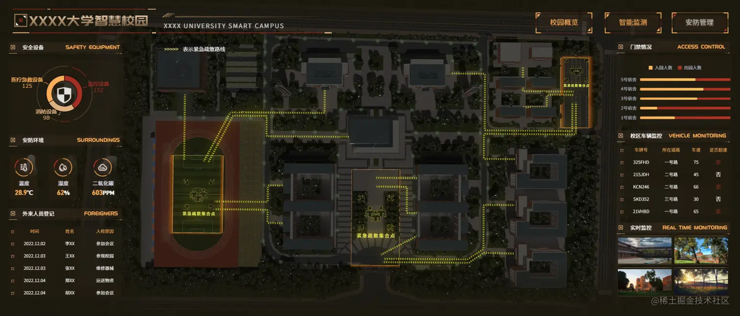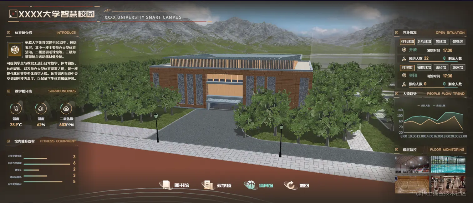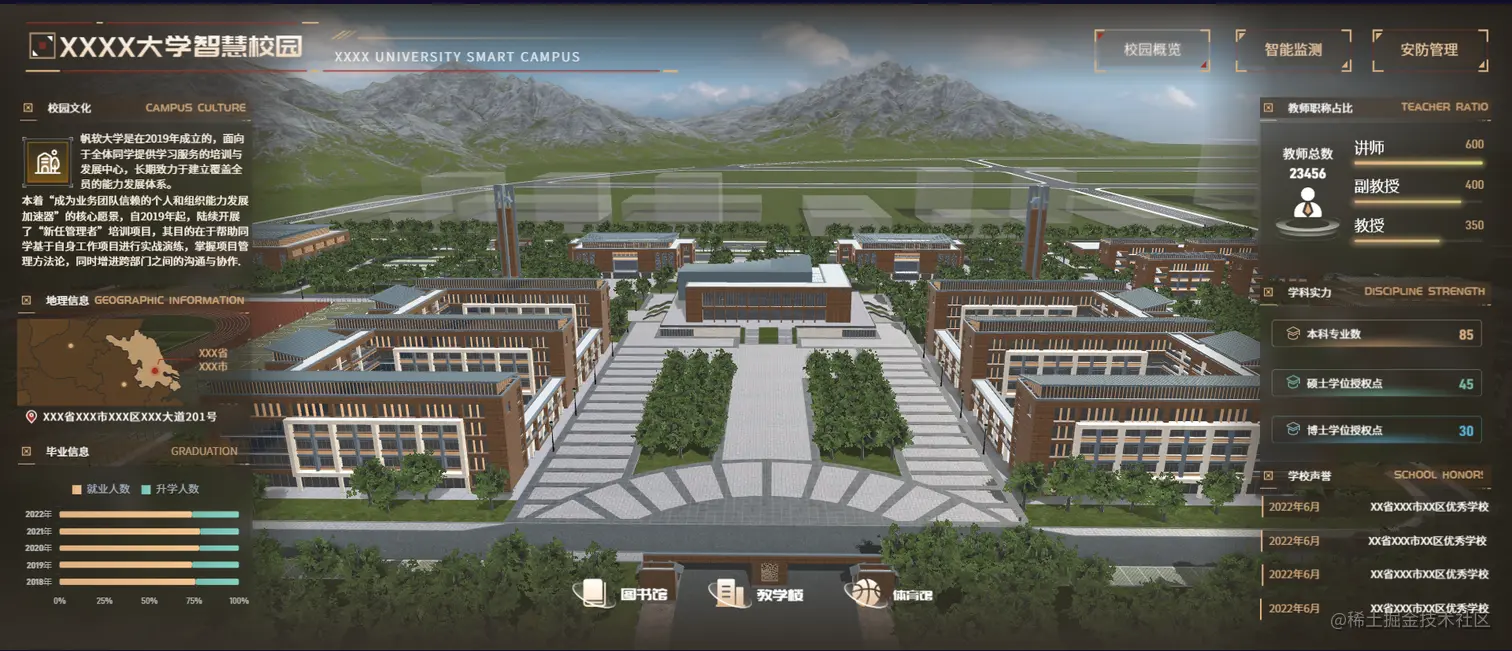 FineVis是国内大屏制作领先工具,属于智慧校园的软件提供方,可以帮助构建校园的全景精细化三维模型,通过三维场景来控制交互,以可视化的图表,对学校的整体情况进行介绍,包括学校简介、师资力量、学科实力、学生管理、学校声誉等,以领导视角展现校园重点统计信息,提高校园管理协同效率。