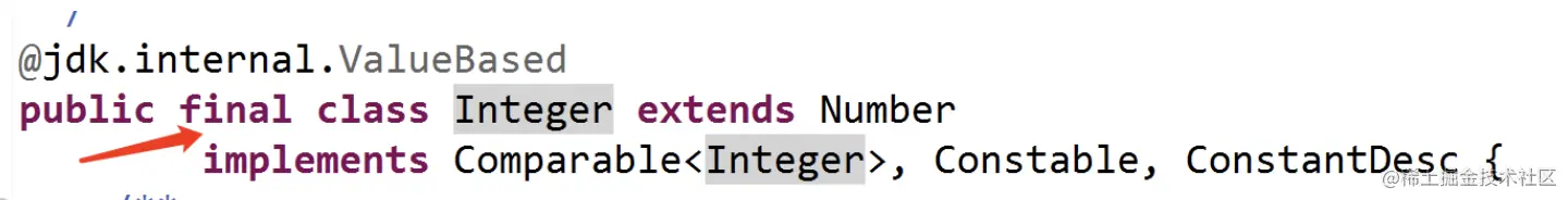 从源码中可以看出,Integer是Number的一个子类,且被final所修饰!请大家回顾我们之前讲过的final知识点。我们知道,被final修饰的类是常量类,该类不能被继承,里面的方法不能被重写,创建出的对象也不能被修改!总之,Integer符合final类的特征。